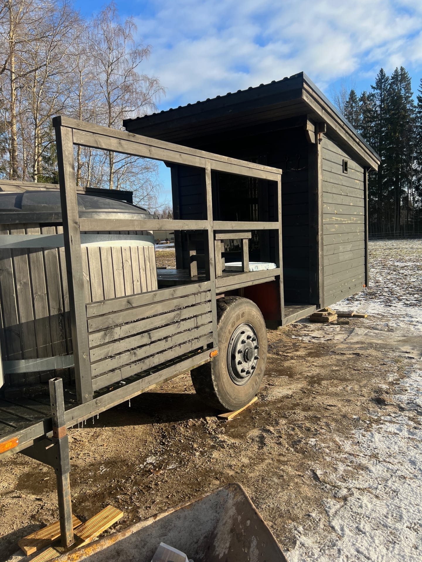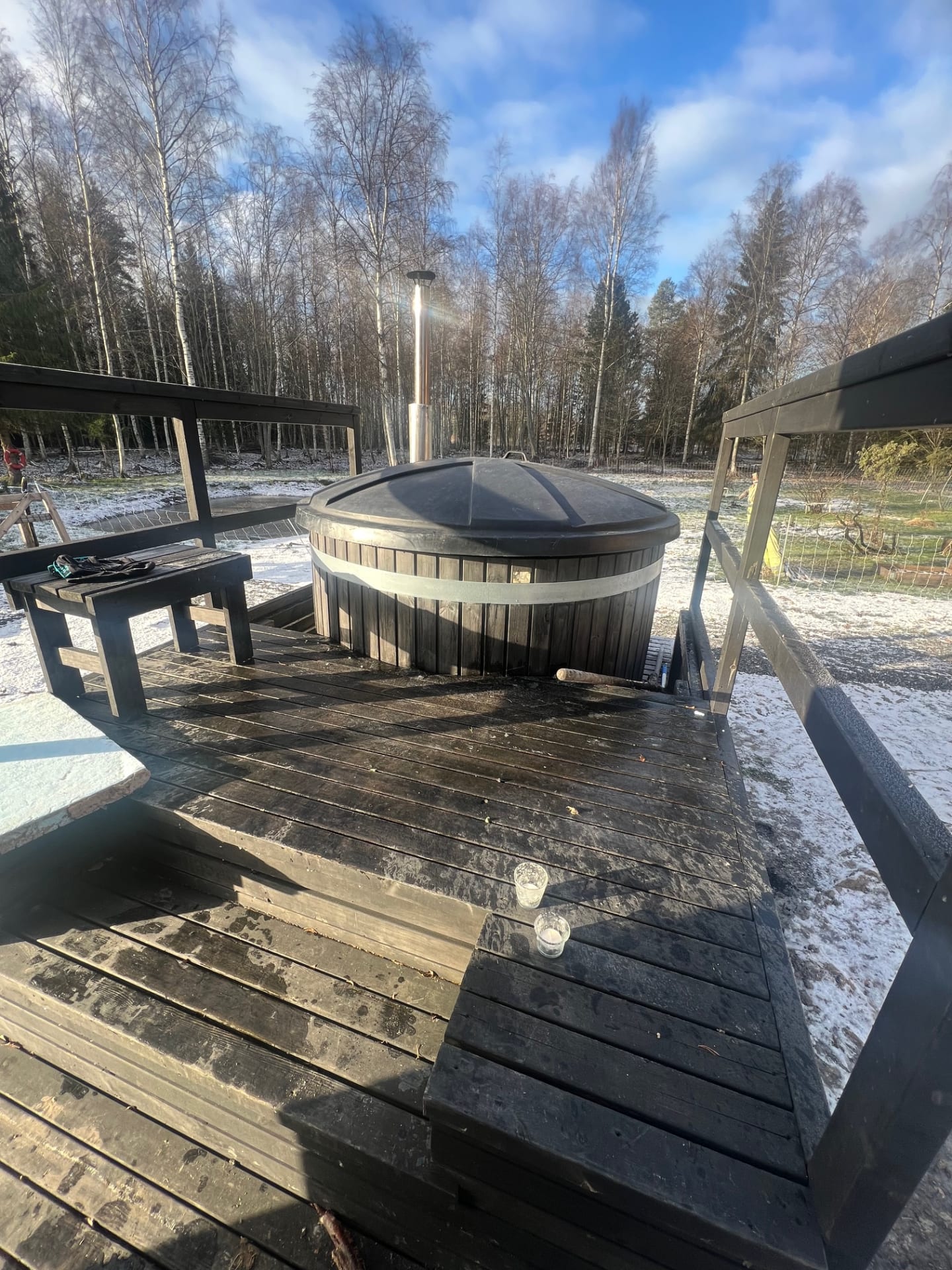 Terassilla on kuuden hengen palju, jota vuokraamme valmiiksi lämmitettynä saunan yhteyteen.